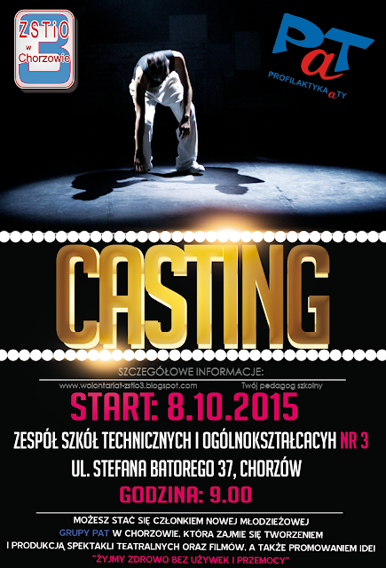 8 października 2015 roku odbył się casting do szkolnej grupy Pat, która powstała na bazie istniejącej już w szkole grupy wolontariatu. Na casting zgłosiło się przeszło 20 uczniów naszej szkoły. Jury w osobach Pani Agnieszki Niemiec i Pana Roberta Gierka wybrało 10 osób. Zwycięscy oraz kilkuosobowa grupa wolontariuszy wyjechała jeszcze w tym samym dniu do Górek Wielkich, by tam przygotować pierwszy swój spektakl profilaktyczny. Dla zainteresowanych programem PaT odsyłamy do oficjalnych stron www.pat.policja.gov.pl oraz www.patchorzow.pl